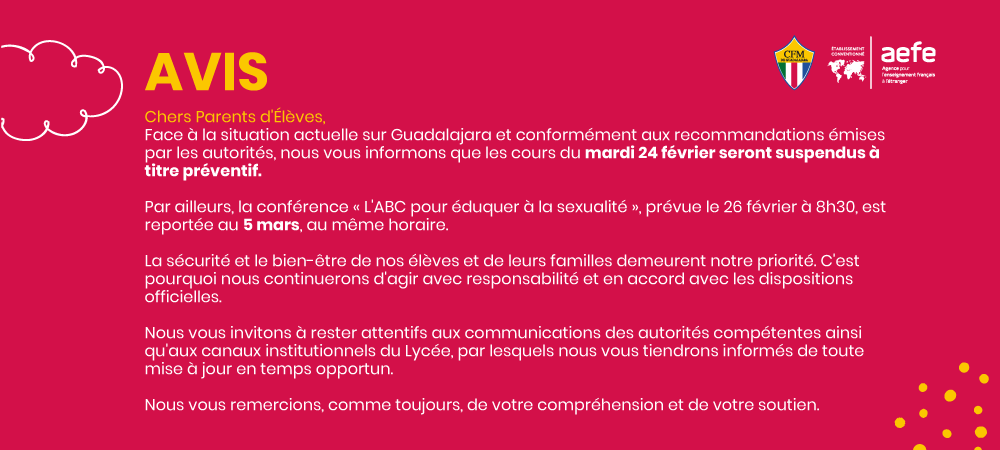 Le CFM est membre de l’AEFE : Agence pour l’Enseignement Français à l’Étranger, référence internationale de qualité, qui complète notre identité locale.