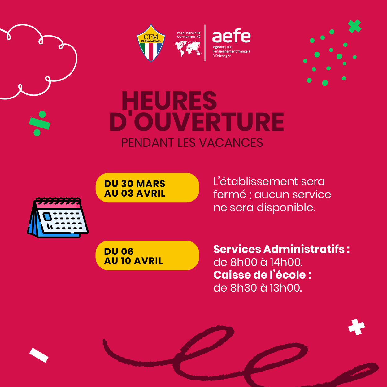 Le CFM est membre de l’AEFE : Agence pour l’Enseignement Français à l’Étranger, référence internationale de qualité, qui complète notre identité locale.